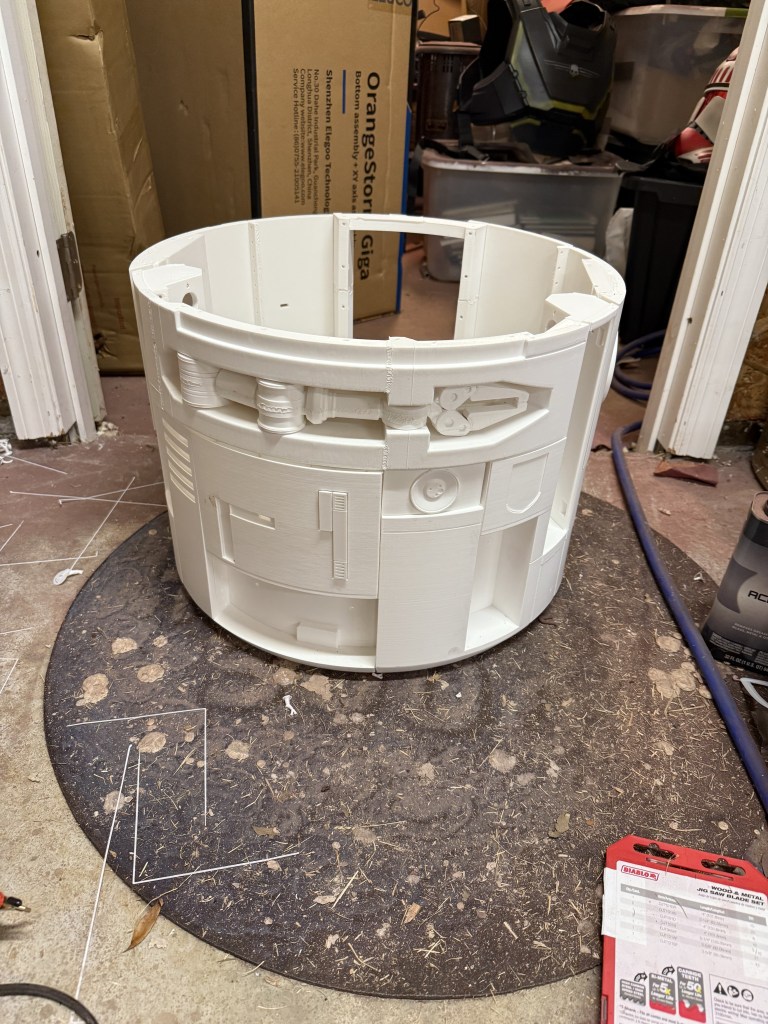 After printing all the panels on my Elegoo OrangeStorm Giga and Bambu Labs Printers, I assembled them into Chopper’s cylindrical body. The white PLA parts snap together cleanly, but you can already see the layer lines that will need smoothing. I used a combination of body filler and acrylic modeling past to fill the seams.